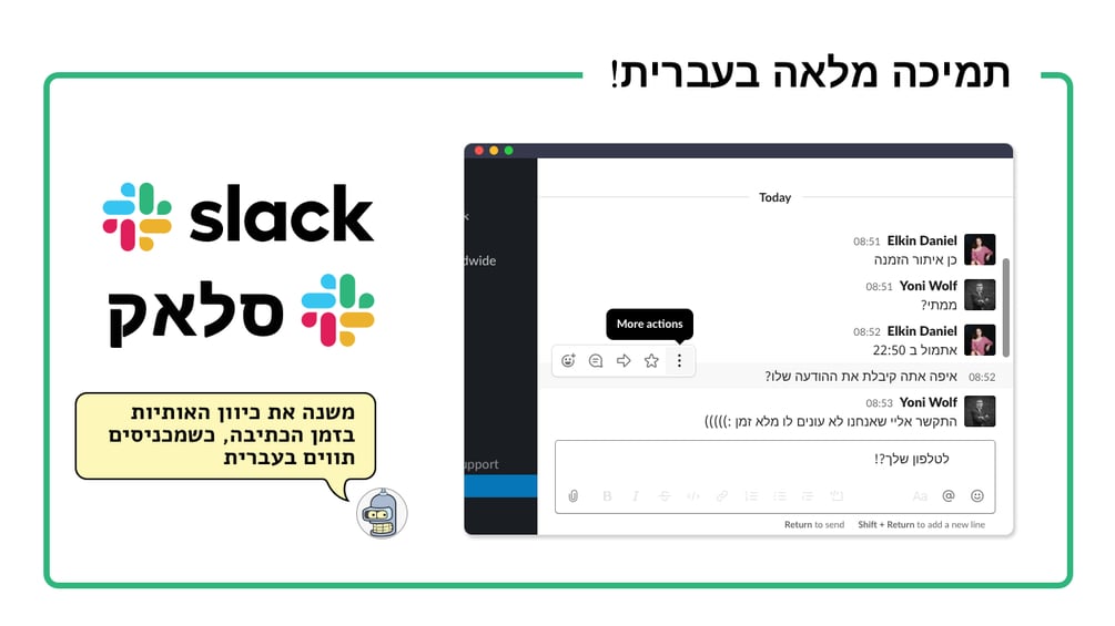 Experience a beautiful, comprehensive, and considerate Hebrew version of Slack with our Chrome plugin.