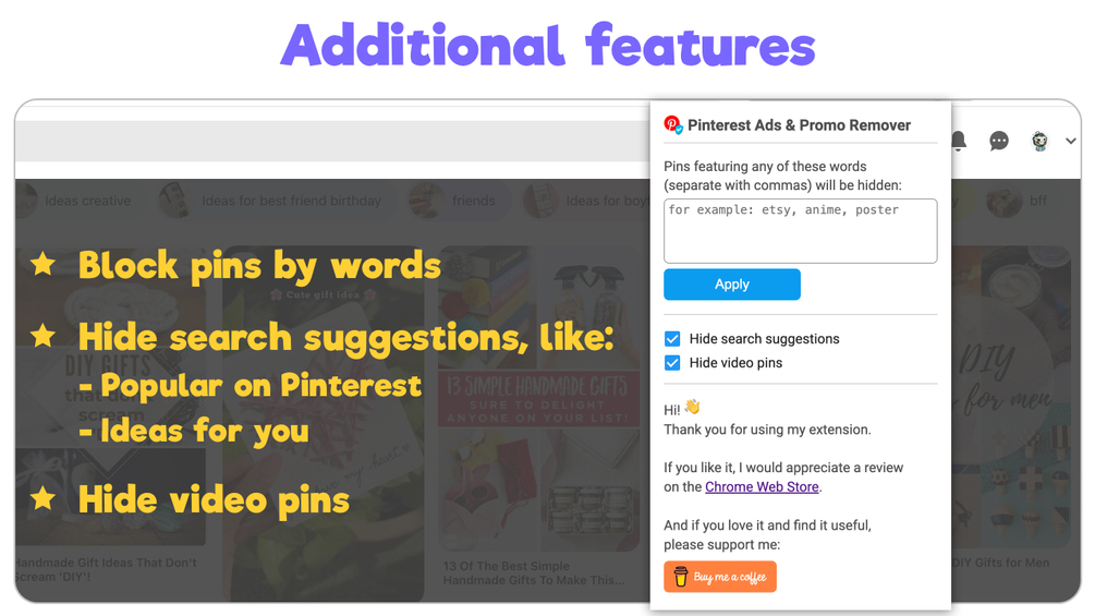 Experience Pinterest Distraction-Free with Ads & Promo Remover.